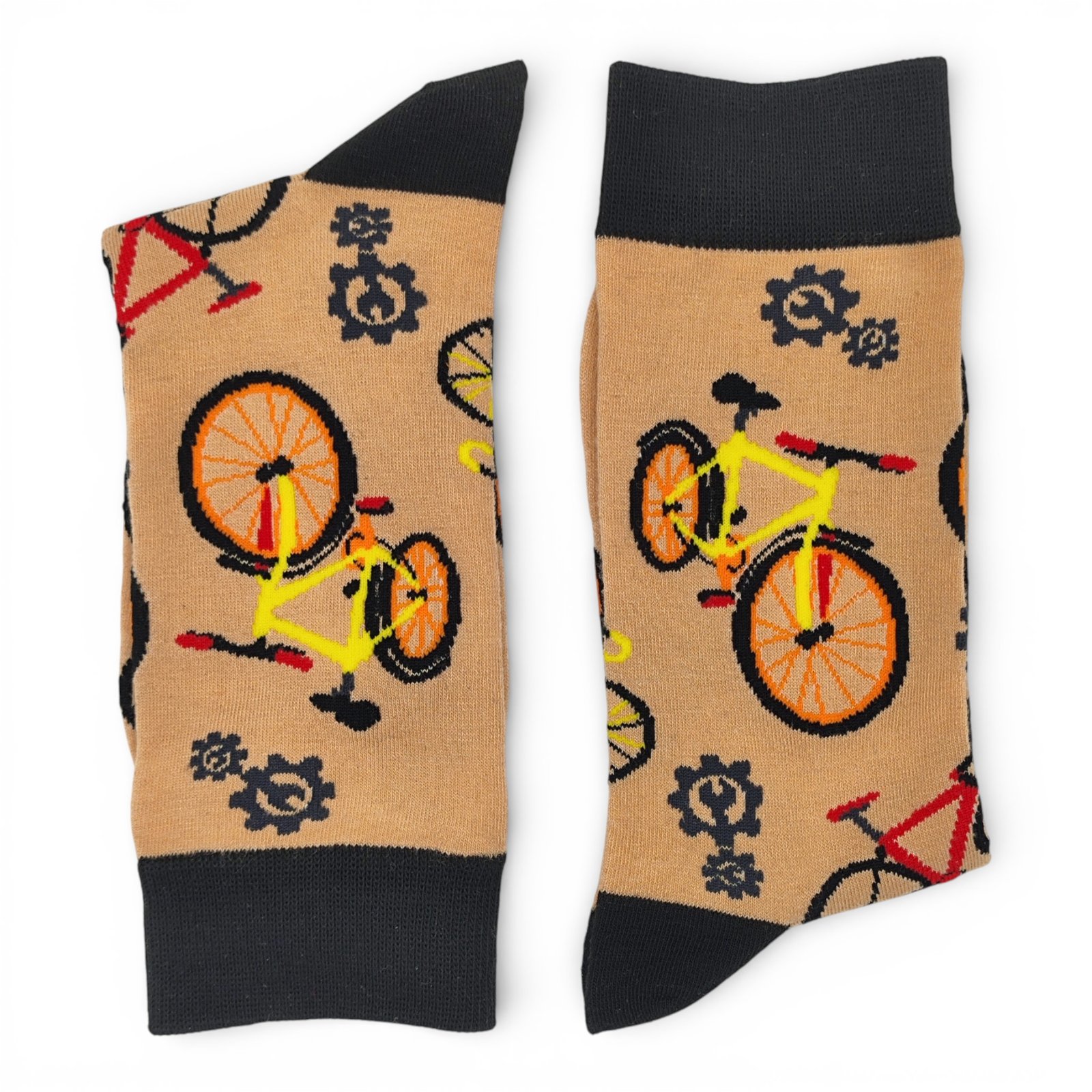 Calcetines Bici Urbana pensados para los amantes de la bicicleta y el estilo original. El fondo beige sirve de lienzo para bicicletas grandes en rojo y amarillo fosforito, con pequeñas tuercas que aportan un toque divertido y detallista, mientras que la puntera, talonera y goma en negro ofrecen un contraste elegante y moderno.