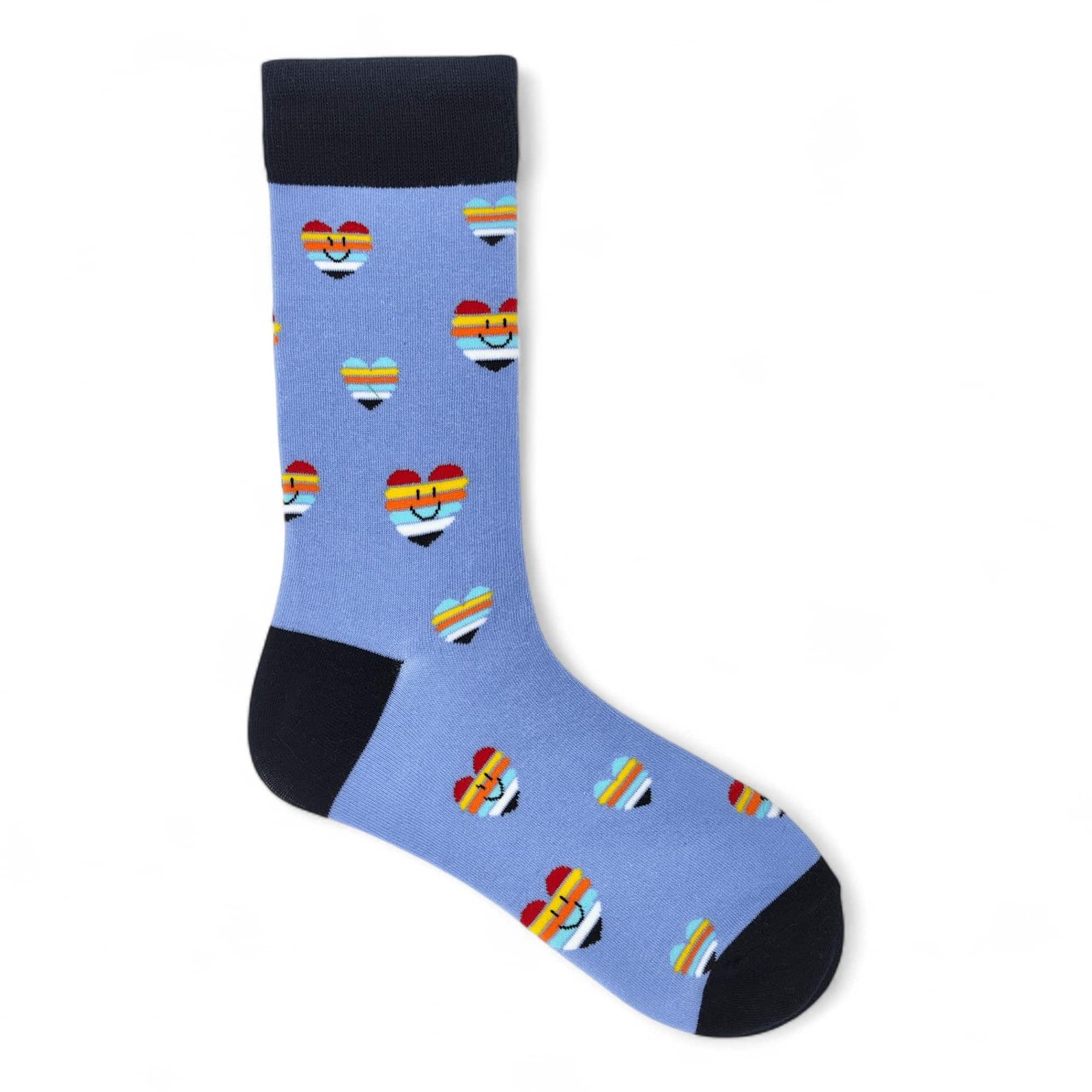 ¡Como pequeños tesoros de color bajo un cielo azul claro! Los calcetines «Blue Sky Hearts» te traen un diseño dulce y vibrante con corazones dispersos, cada uno llenos de rayas coloridas, flotando sobre un apacible fondo azul. Un toque de alegría y encanto para tus pies que te hará sentir ligero y feliz. Fabricados con materiales de excelente calidad, son cómodos y transpirables,