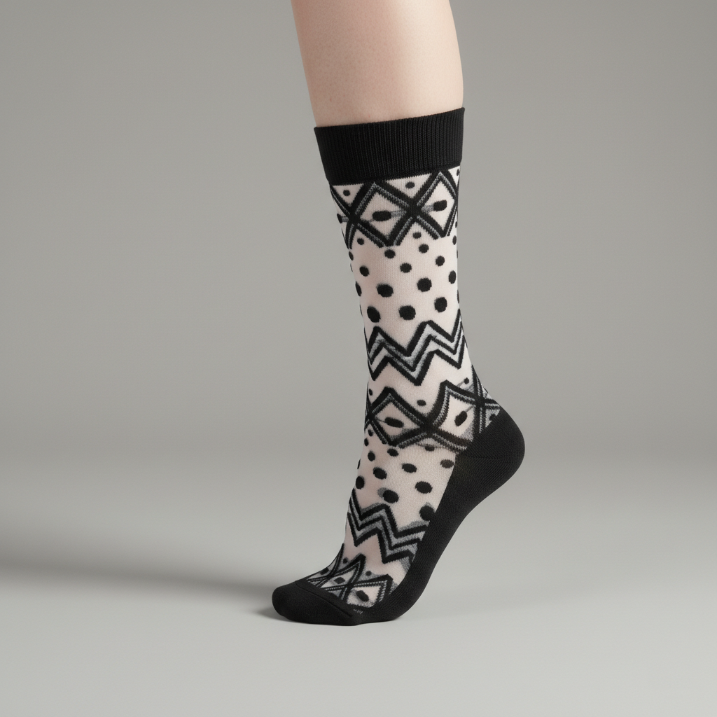 Calcetines Clairé Dot diseñados para quienes buscan un toque femenino, elegante y moderno en su día a día. El diseño transparente combina puntos y líneas en zigzag, creando un patrón delicado y visualmente ligero que realza cualquier look sin robar protagonismo.
