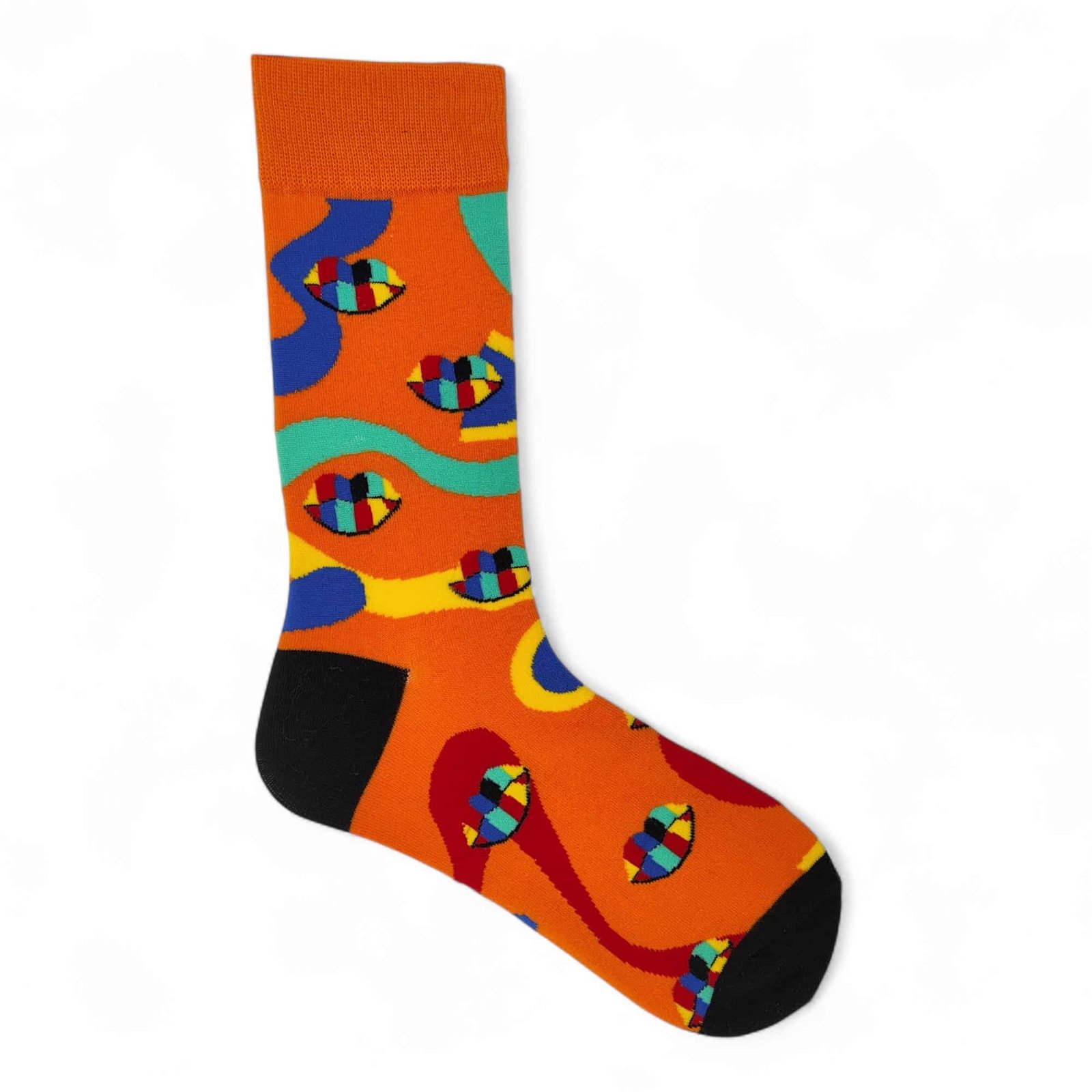Los calcetines «Cromatic Lips» son una explosión de arte y audacia para tus pies. Sobre un vibrante fondo naranja, se despliegan labios estilizados rellenos de un mosaico de colores vivos, intercalados con formas abstractas y fluidas en tonos azules, verdes y amarillos que evocan la energía de un movimiento artístico. Es un diseño único que irradia creatividad y una personalidad atrevida. Confeccionados con materiales de muy buena calidad, son cómodos, suaves y transpirables, perfectos para quienes buscan un toque de vanguardia y diversión en su atuendo diario.