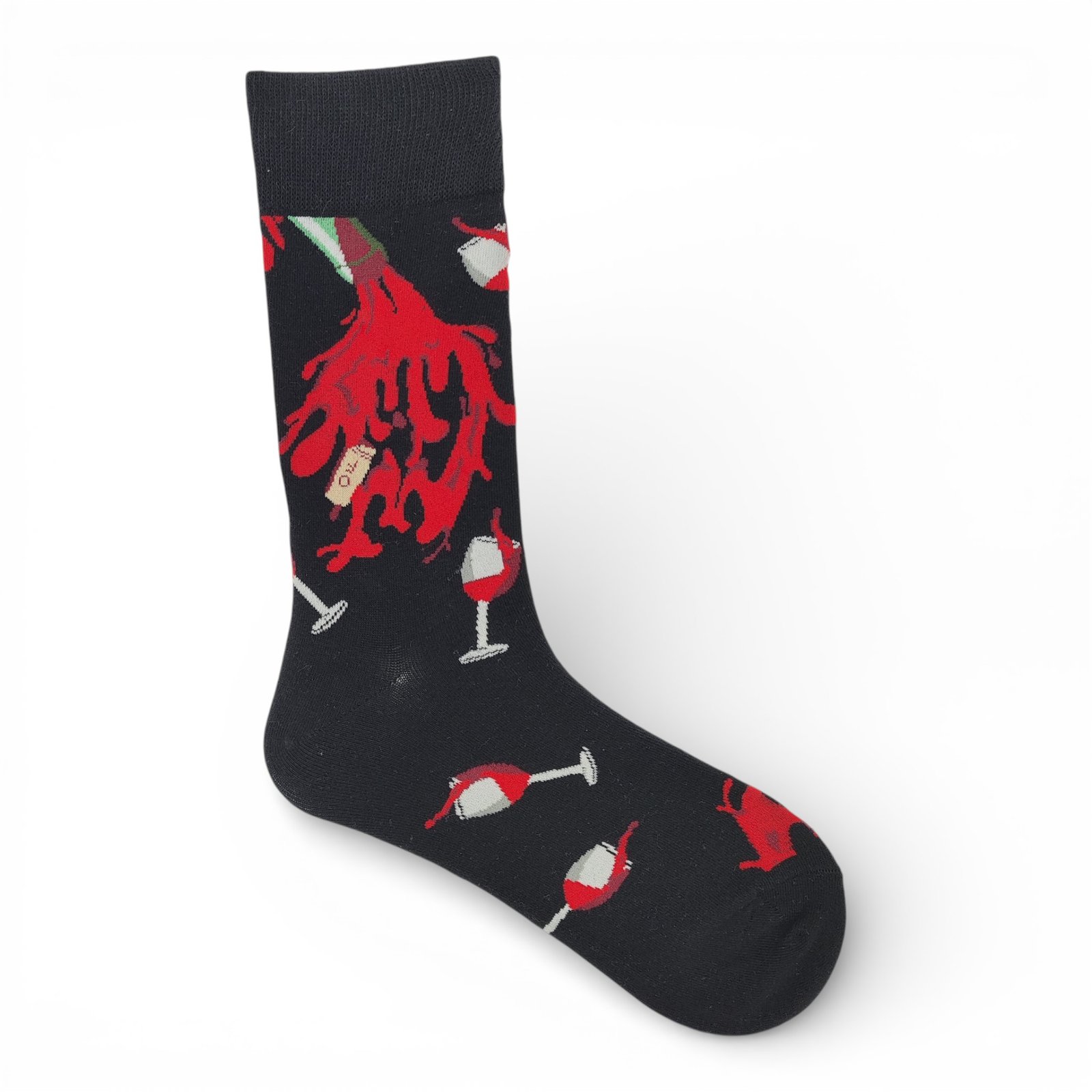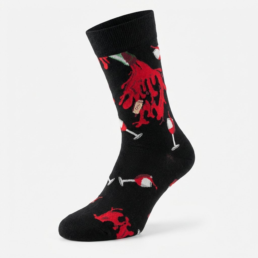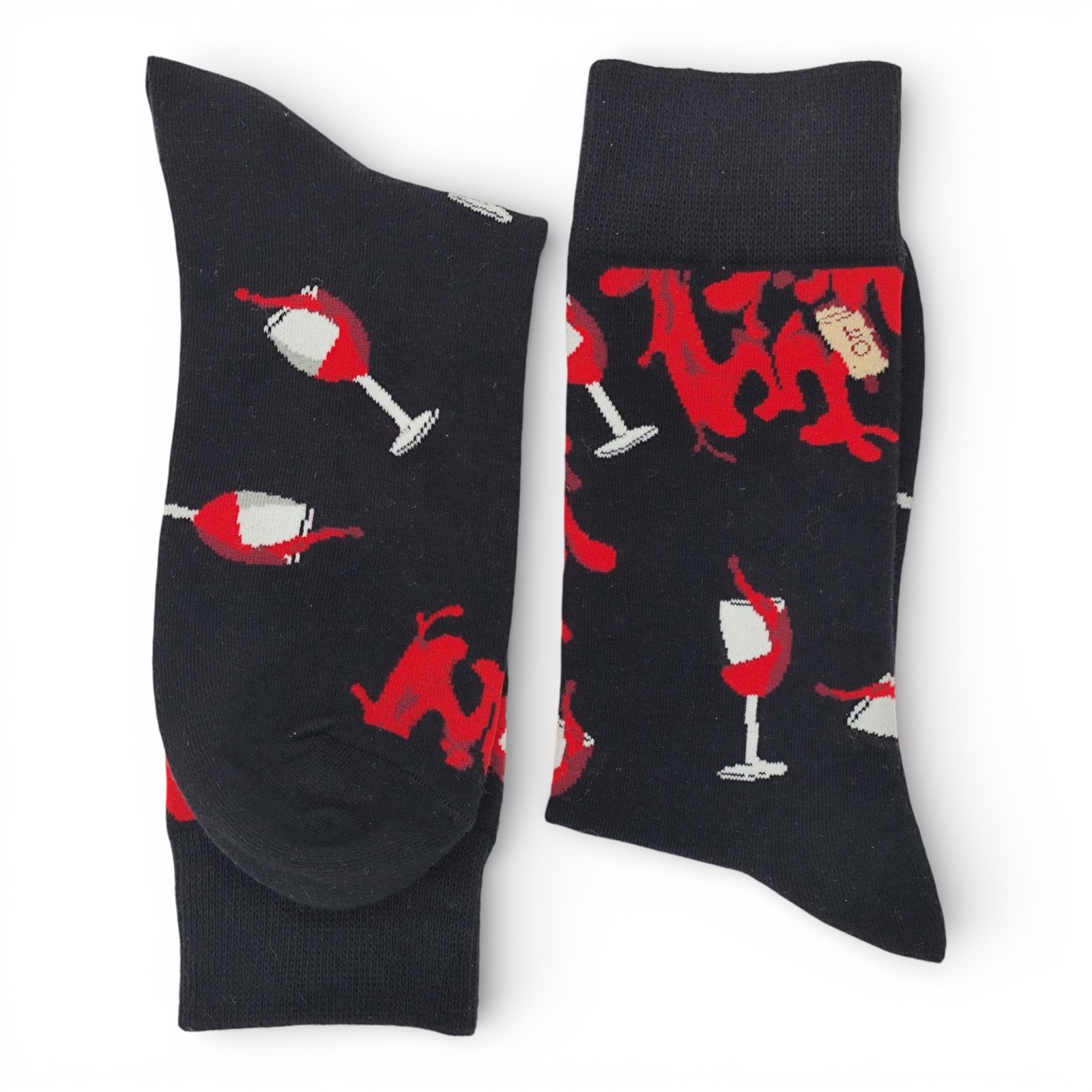 Calcetines Entre Copas diseñados para los amantes del vino y los momentos especiales. El fondo negro resalta las ilustraciones en rojo y blanco de copas y botella derramando vino, creando un contraste elegante y moderno que aporta estilo y sofisticación a cada paso.
