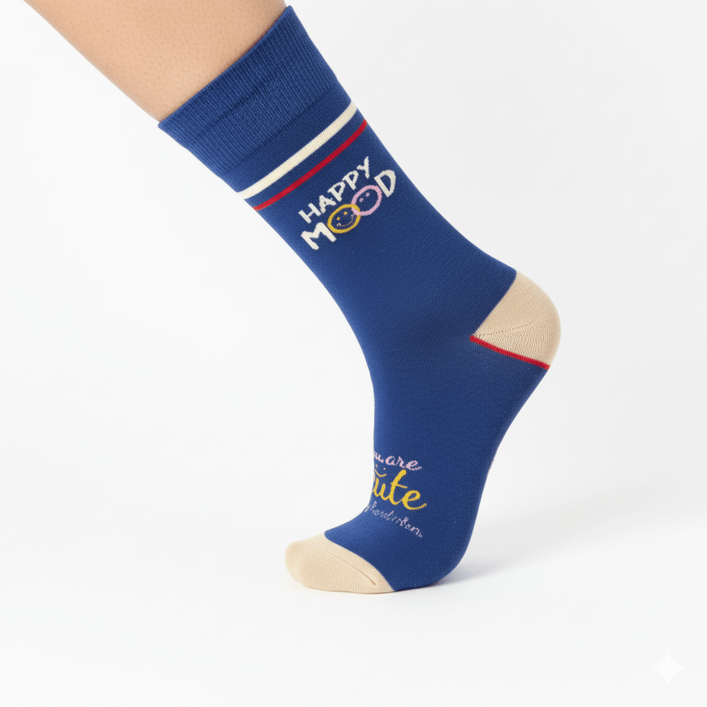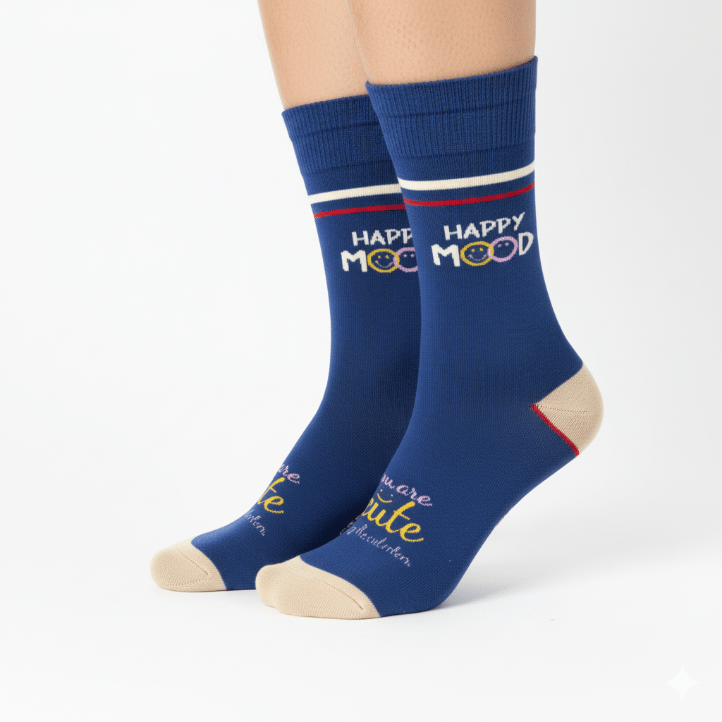 Estos calcetines son perfectos para agregar un poco de alegría a tu día, reflejando tu espíritu optimista y tu actitud atrevida. El azul como color base te transporta a un cielo despejado, mientras el mensaje vibrante «Happy Mood» y los emojis te recuerdan que la felicidad está en los pequeños detalles.