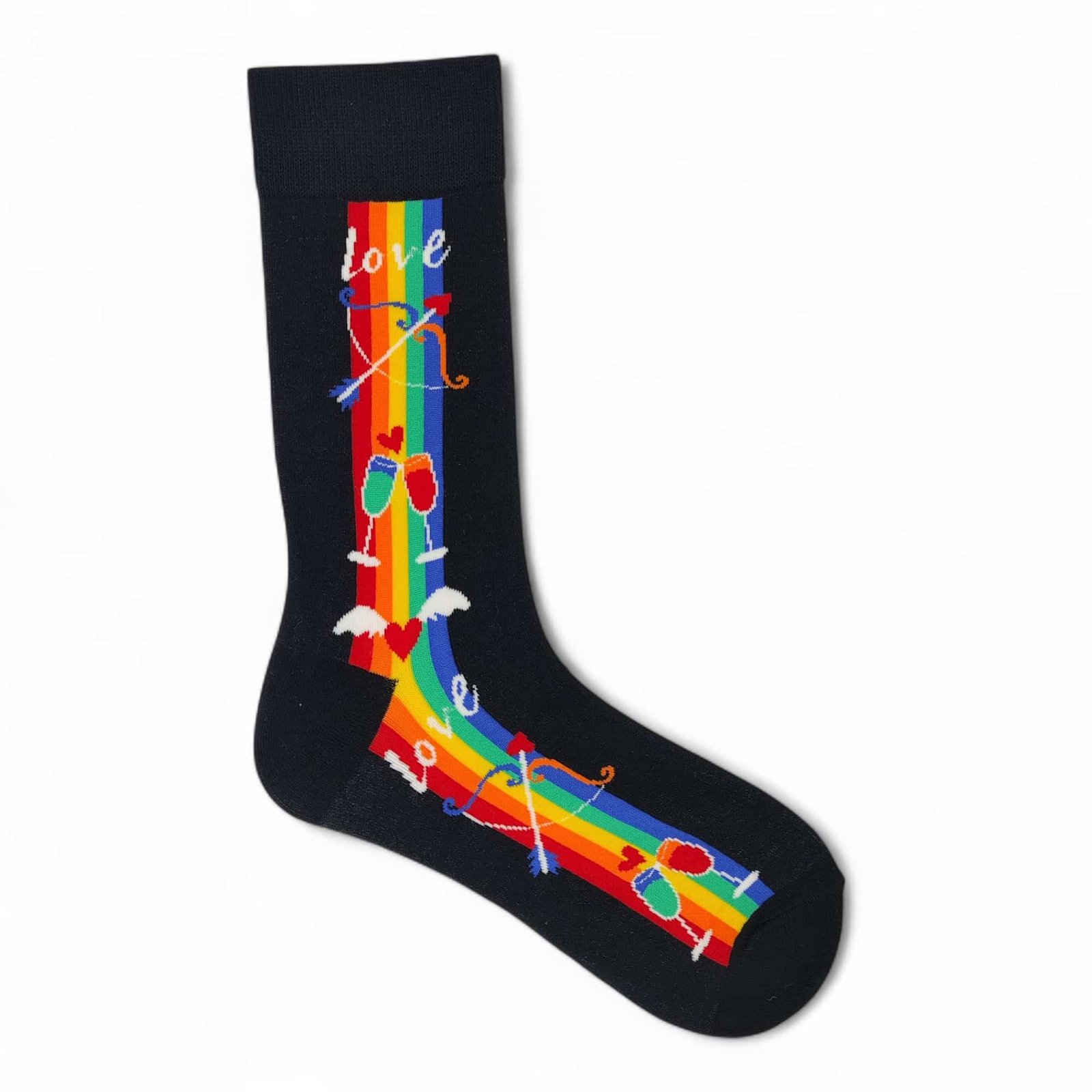 Prepárate para sentir mariposas en el estómago con los calcetines «Love Connection». Sobre un elegante fondo negro, un vibrante arcoíris se desliza, sirviendo de escenario para un sinfín de elementos que celebran el amor y la conexión: arcos y flechas de Cupido, copas de brindis con corazones, la palabra «LOVE» delicadamente escrita, y sutiles corazones que revolotean. Es un diseño que evoca la emoción de una primera cita o la dulzura de un amor consolidado. Confeccionados con materiales de muy buena calidad, son cómodos, suaves y transpirables, perfectos para añadir un toque romántico y lleno de color a tu estilo.