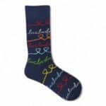 Siente el ritmo del amor en cada paso. Los calcetines «Love» presentan un diseño continuo con ondas de «lovelove» entrelazadas con corazones de colores vibrantes sobre un profundo fondo azul marino. Un patrón que simboliza conexión y afecto sin fin.