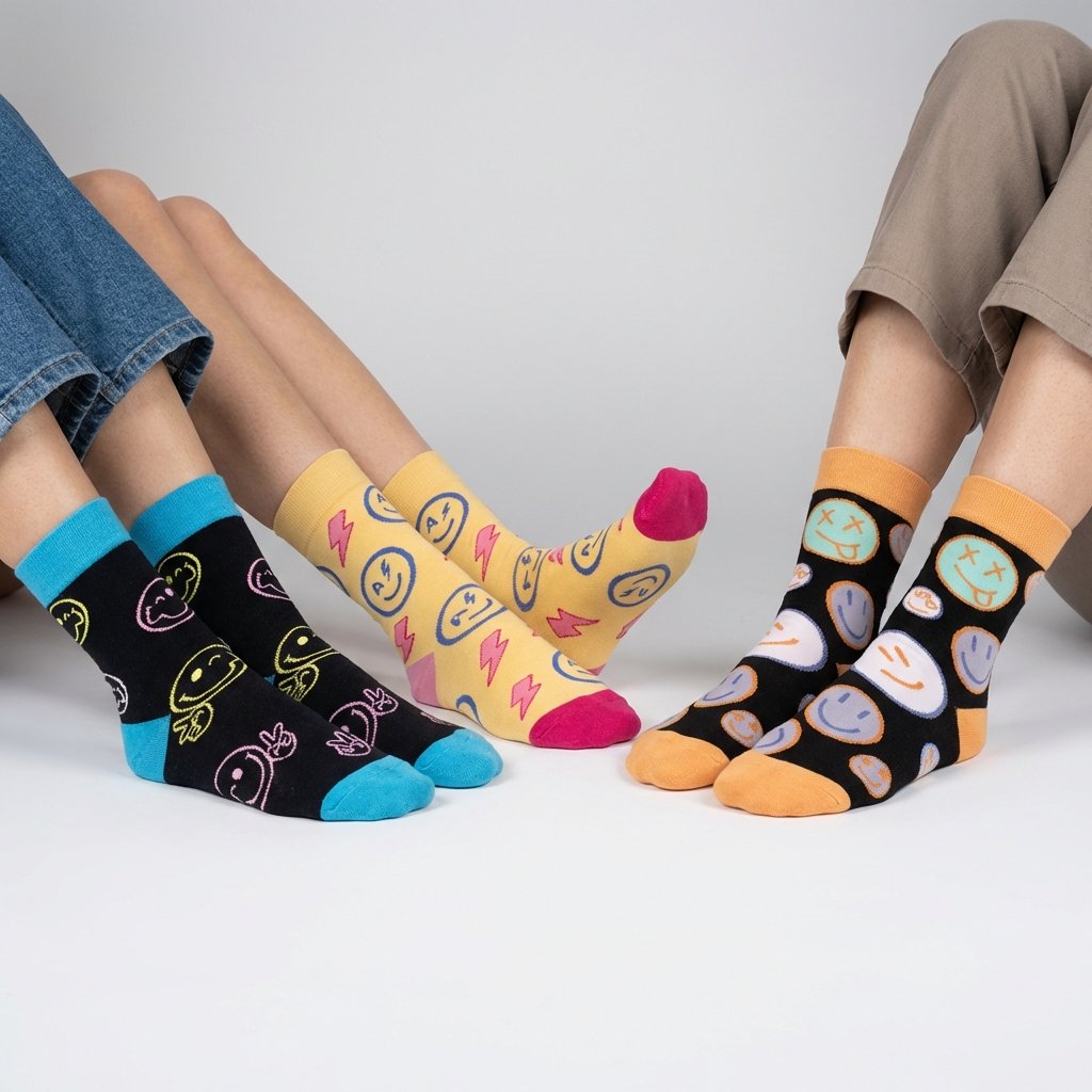 Dale un toque de color y diversión a tus pies con estos calcetines»Sonrisa al mundo». Su diseño con caritas felices que te harán sonreír en cada paso. ¡Perfectos para combinar con cualquier outfit y contagiar tu buen humor a todos los que te rodean.