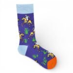 Combina un fondo lila con elegantes figuras de hombres jugando polo a caballo, talón y puntera naranja, y goma azul claro. Un diseño sofisticado, moderno y lleno de estilo, perfecto para quienes buscan un toque deportivo con personalidad.