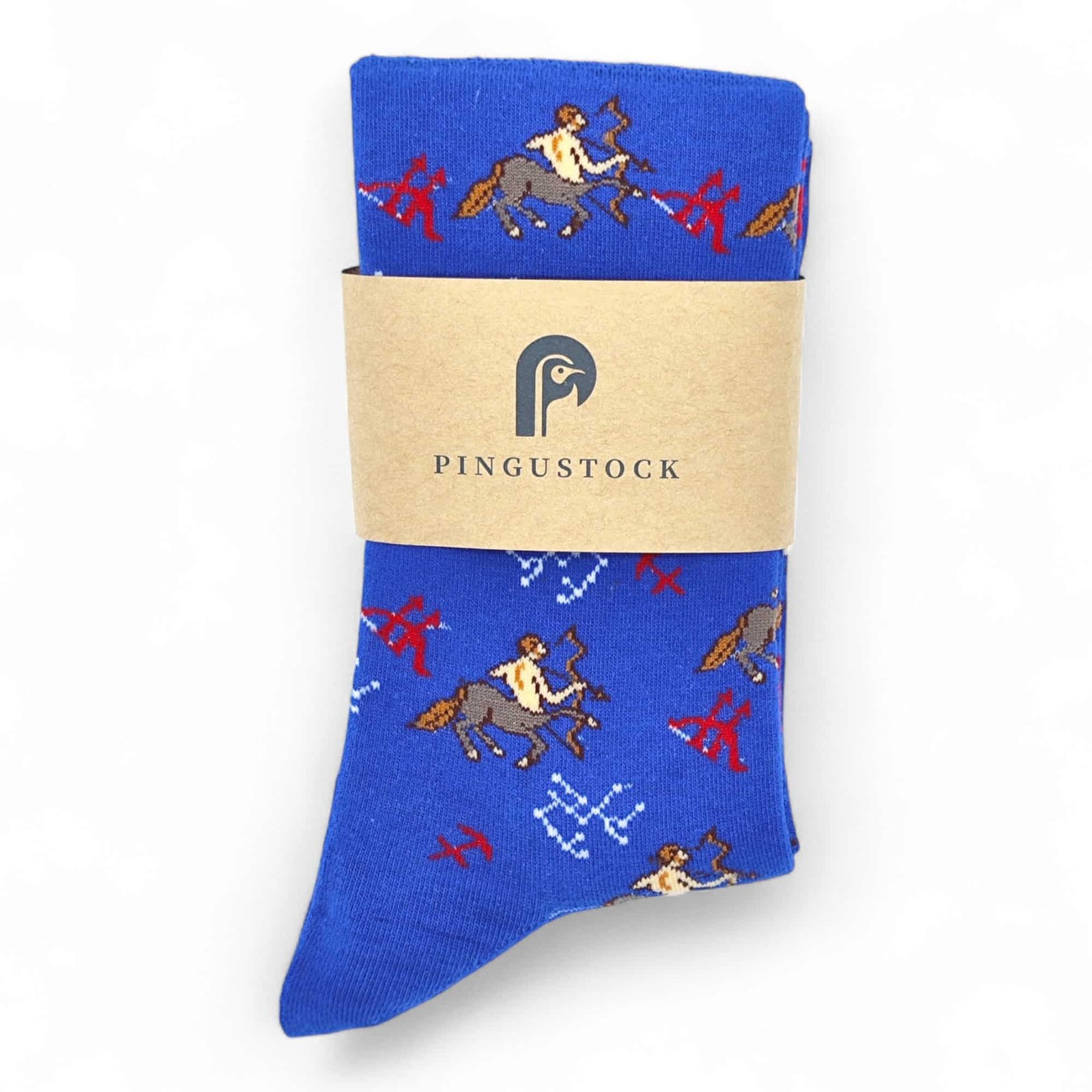 Sagitario, tu pasión por explorar no tiene lÃmites! Estos calcetines, diseñados para espÃritus libres como el tuyo, reflejan tu dinamismo. Su vibrante azul eléctrico evoca el cielo infinito, mientras el sÃmbolo y constelación de tu signo te señalan el camino.